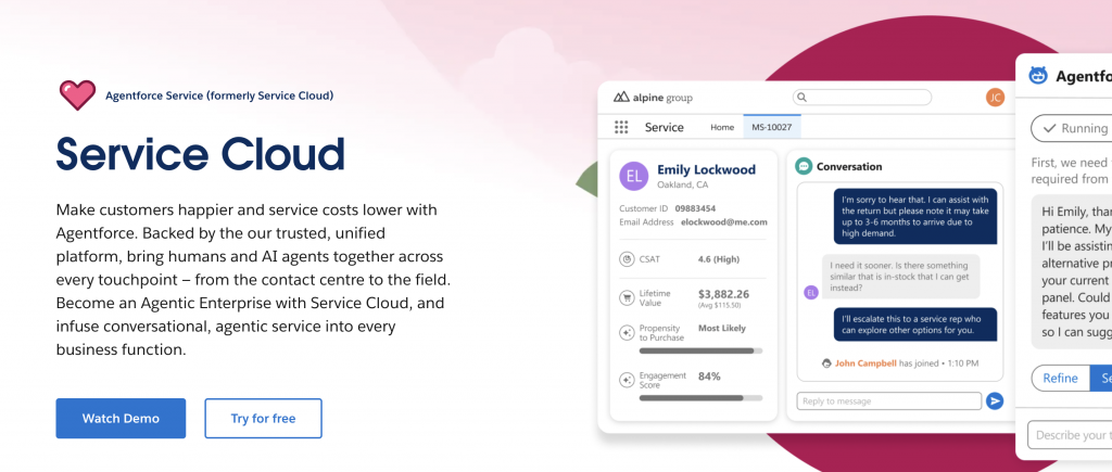 Salesforce Service Cloud is a comprehensive customer service solution deeply integrated within the Salesforce ecosystem. It leverages Customer 360 to unify sales, service, marketing, commerce, and IT data for holistic customer views. Service Cloud’s primary strength is its deep integration with Salesforce CRM and the broader Salesforce platform. This enables powerful automation workflows that span across departments and customer lifecycle stages. The platform offers sophisticated case management, extensive automation and workflow capabilities, and robust knowledge management.