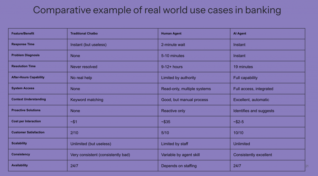 In our payroll scenario, the chatbot told the treasury manager to call during business hours. It couldn’t access her account, couldn’t see the transaction, and couldn’t help. It was essentially a fancy FAQ system that created more frustration than it solved.