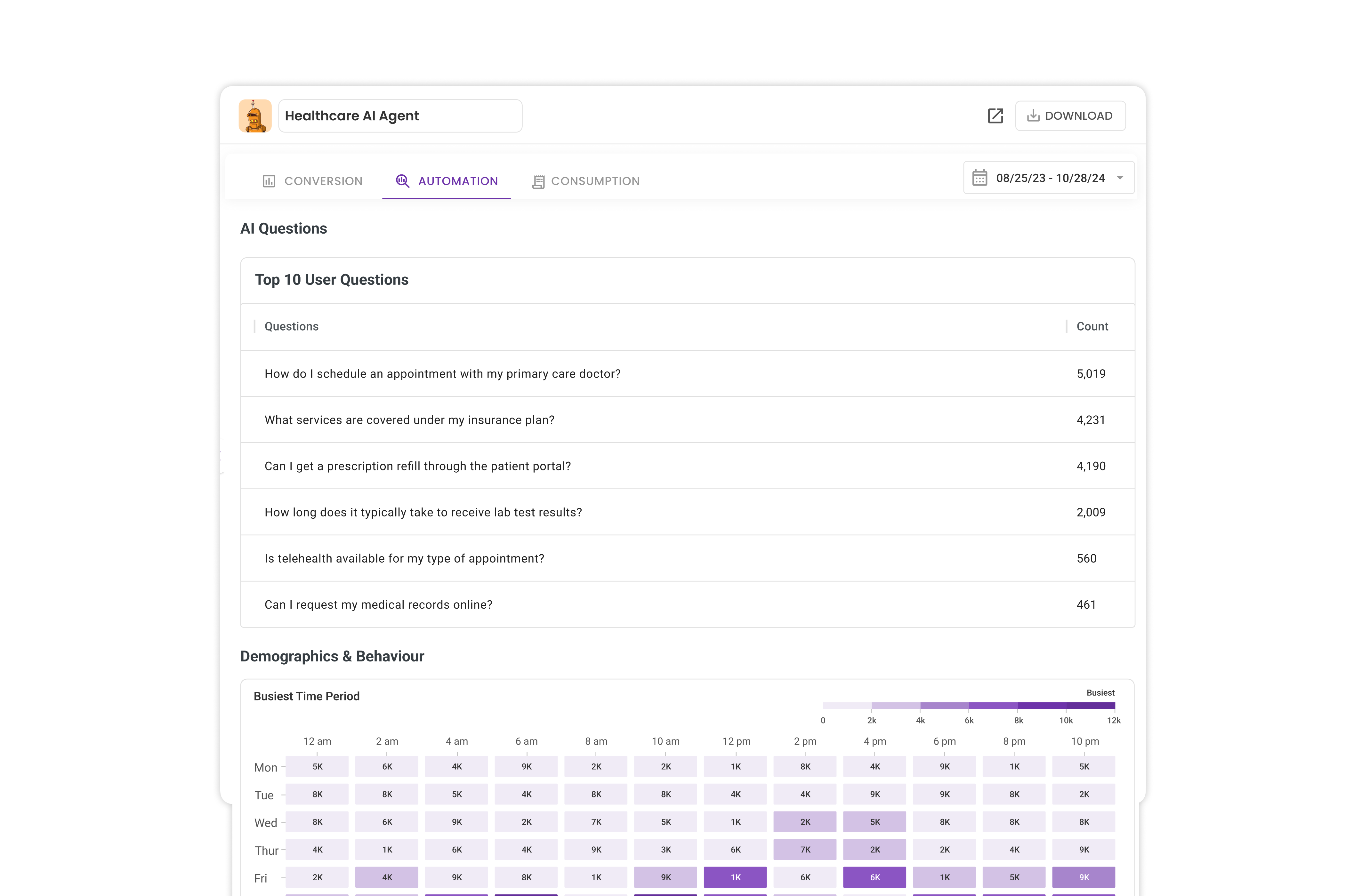 The system analyzes conversations and surfaces key user patterns. "Users asked about bulk pricing 47 times with no satisfactory answer." "Drop-off rate at the payment step increased 22% this week." Patterns emerge automatically from conversation data without manual analysis. Uncover data about your key demographic and user journey patterns to improve the AI Agent.
