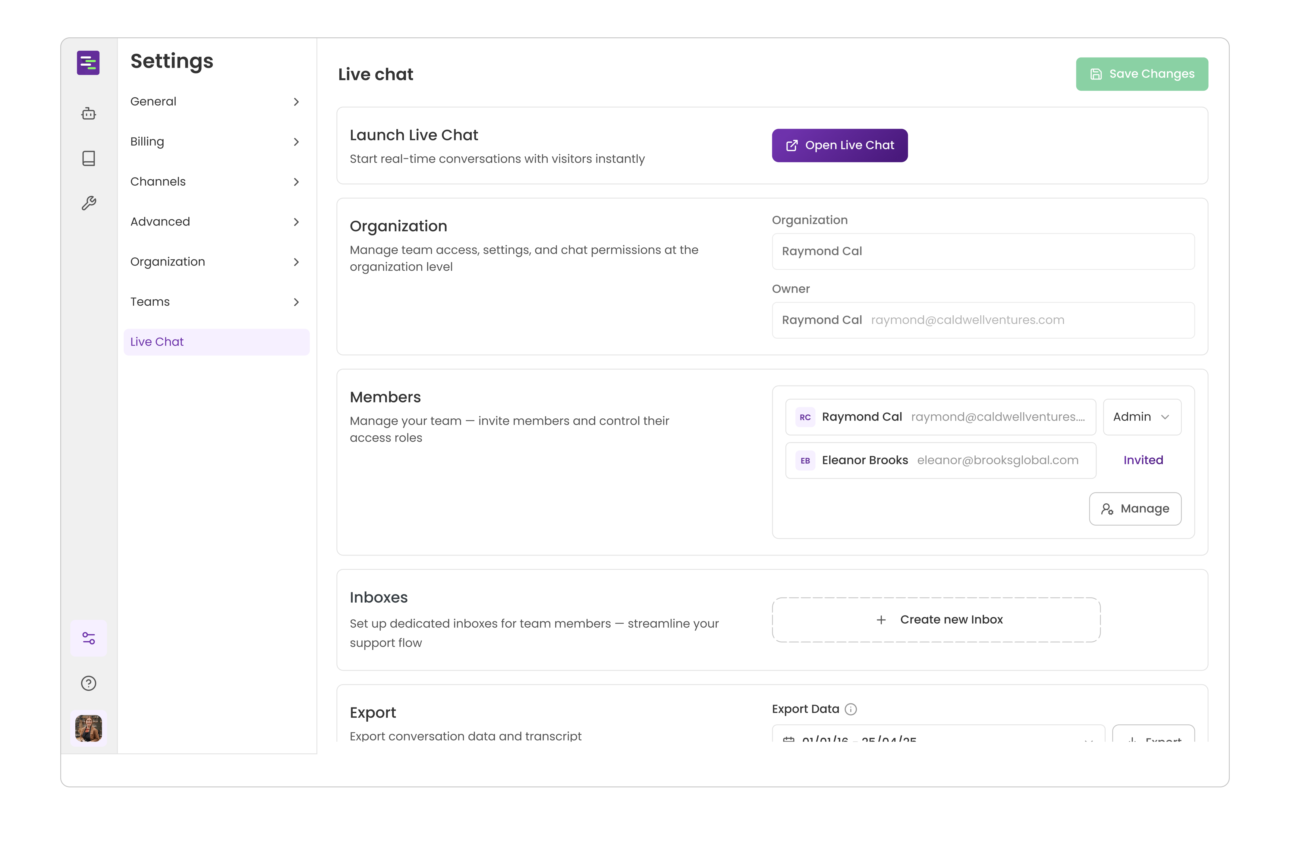 Already using another live chat solution? Keep it. Our AI Agent integrates directly with your current platform in minutes through API connection. Your Agents continue working in the same interface they know, while the AI Agent handles incoming chats automatically. Built-in tools capture customer information (name, email, company, inquiry details) during conversations without manual forms.