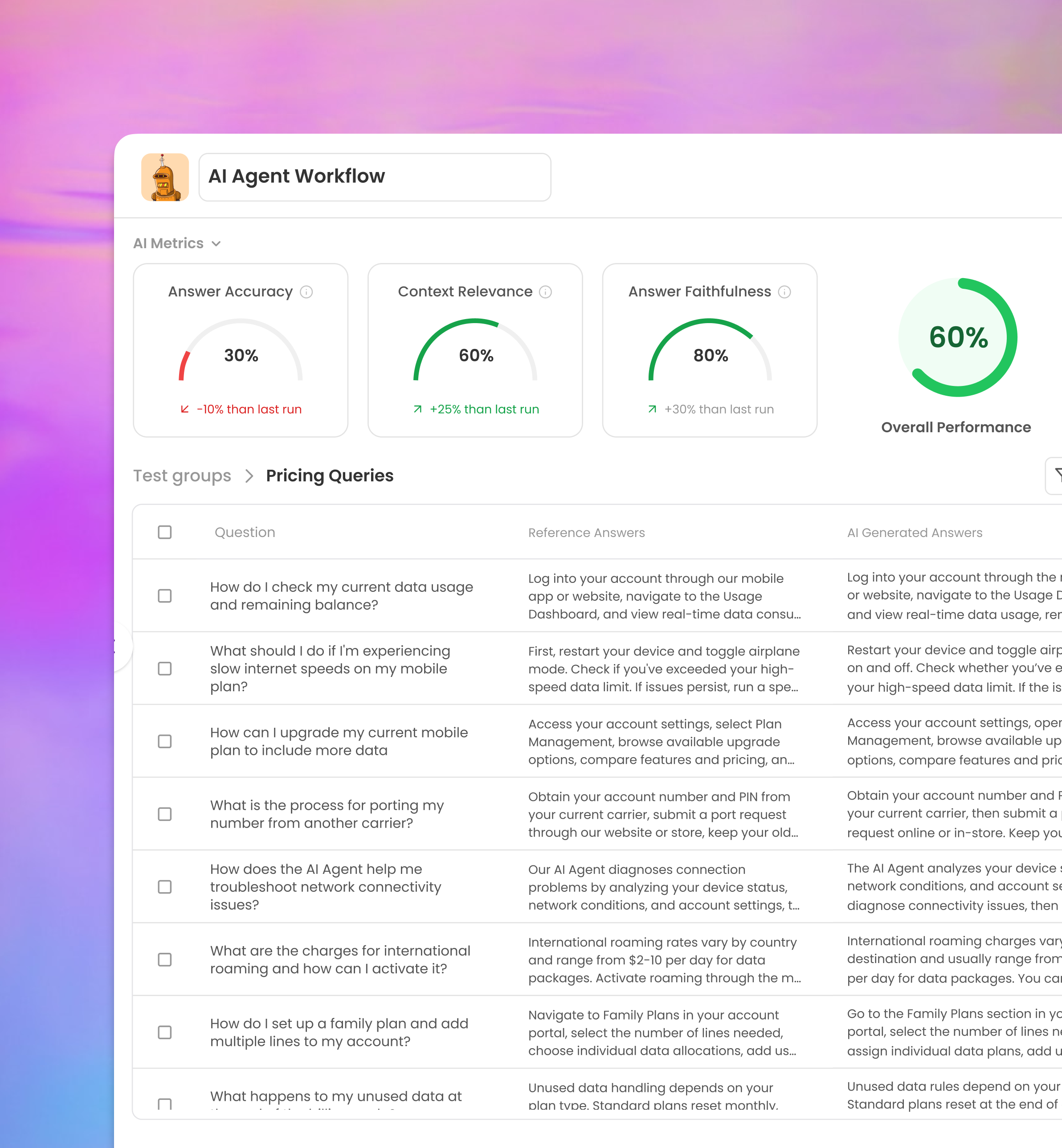 - The Agent learns your specific offerings around data limits, roaming charges, family plan structures, and device financing options. When a subscriber asks about overage charges or international calling rates, the Agent retrieves their exact plan details and explains costs in clear language.